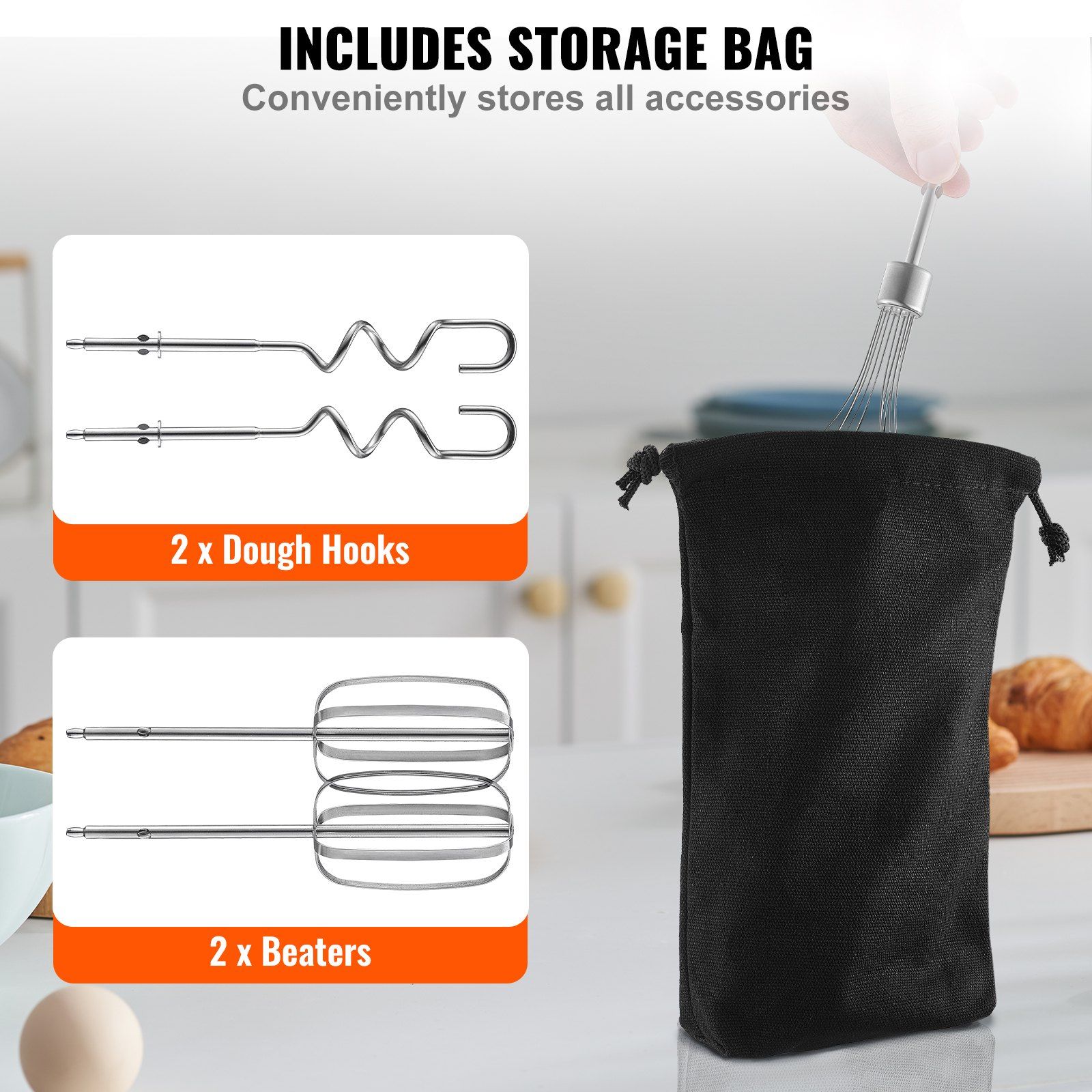 3.Convenient Storage Bag: This mixer electric handheld comes with a storage bag for extra storage space to conveniently hold all your accessories, which not only keeps your countertop organized but also reduces the likelihood of accessories getting lost or misplaced, making it easy to find everything you need while also saving space.